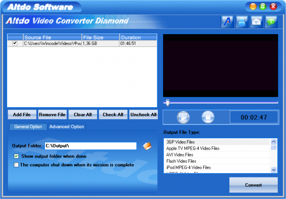 Altdo Video Converter Diamond - конвертер большинства популярных аудио и видео форматов. Поддержка AVI(DivX/XviD, Pocket PC), VOB, PMP, PSP, MOV, AMR, MP3, AAC, AC3, MPEG-4(iPod, Zune, Apple TV), MPG(XBox360), VCD (MPEG-1), SVCD(MPEG-2) и других аудио и видео форматов. Поддержка PC, laptop, Mobile Phone, Pocket PC, Apple TV, XBox, PSP, iPod, Microsoft Zune, MP4 player и других мобильных устройств.