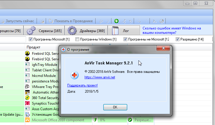 Программа AnVir Task Manager - это мощный менеджер процессов и программ автоматической загрузки, который совмещает в себе также функции antispyware и анти-трояна. Отображает очень подробную информацию о запущенных процессах как, например, dll, потоки, соединения, окна, драйвера, хендлы, версию файла и т.п., в трее показывает уровень загрузки процессора и диска. Осуществляет мониторинг попыток добавления программ в автозагрузку.