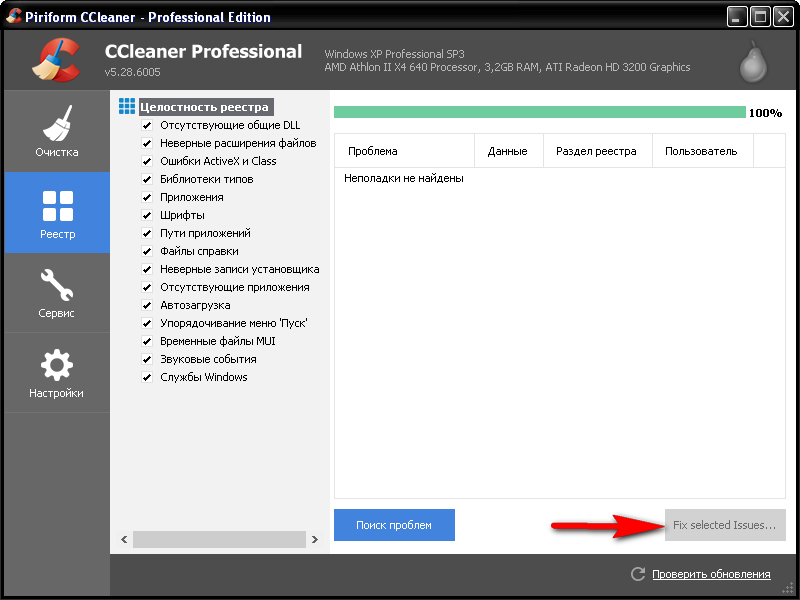 - Чистка и оптимизация реестра. Встроенный в программу чистильщик реестра позволяет проводить диагностику, выявляя проблемы и определяя неиспользуемые записи. Удаляются неиспользуемые расширения файлов, элементы управления ActiveX, ClassID, ProgID, общие библиотек DLL, ссылки на удаленные из системы шрифты, файлы справки, иконки, неверные ярлыки и многое другое.