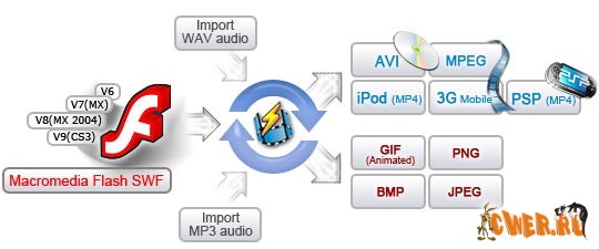Мощная программа поддерживающая конвертацию SWF в видео форматы: AVI, MPEG, iPod video, 3GP video , PSP video, анимированные Gif или в изображения (BMP, PNG, GIF, and JPEG).
