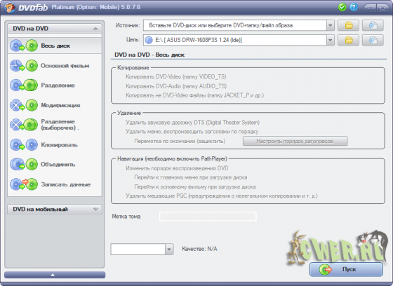 DVDFab Platinum – мощный, многофункциональный программный продукт для копирования DVD дисков с возможностями гибкой обработки видеопотока. Программа является одной из лучших на сегодняшний день, из инструментов для копирования, разбиения, пережатия и конвертирования DVD дисков с фильмами. Снимает все защиты и ограничения с диска и при желании пережмет диск большой емкости и вместит его в обыкновенную пустую DVD болванку с минимальными потерями качества (DVD9->DVD5) или разобъет фильм на два диска с полным переносом его меню, удалит всю рекламу, запишет только фильм и многое другое. Программа имеет интуитивно понятный, мультиязычный интерфейс включая русский.