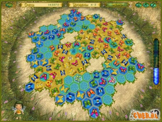 Несколько дней назад над далекой волшебной страной прошла сильная буря, которая разрушила до основания домик маленькой феи. Вам предстоит восстановить его, но прежде нужно собрать волшебную энергию — ману. Чтобы добыть ее, перемещайте по игровому полю бабочек всевозможных оттенков таким образом, чтобы после каждого хода получалась группа или линия как минимум из 3 крылатых красавиц одного цвета.