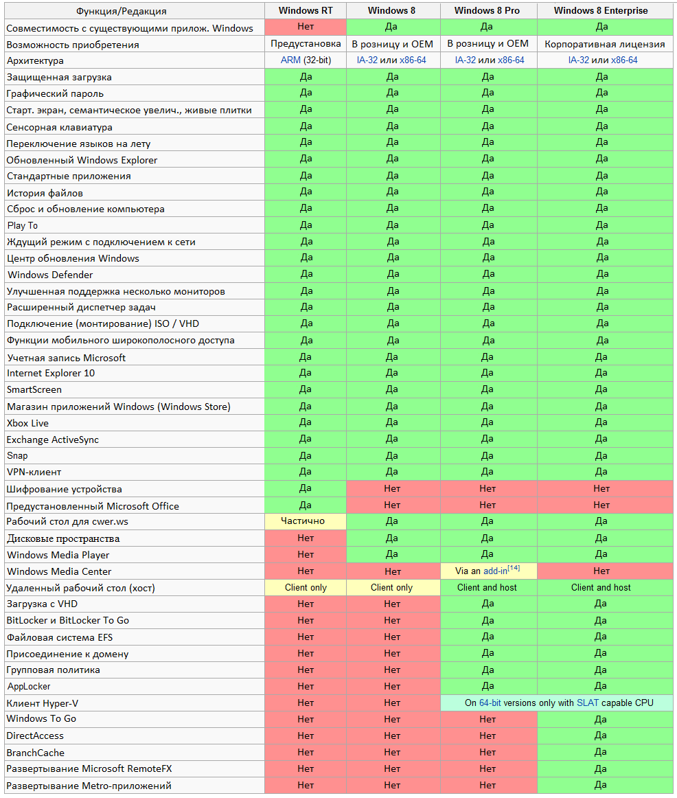 Сравнение редакций Windows 8 (для увеличения нажмите на картинку)