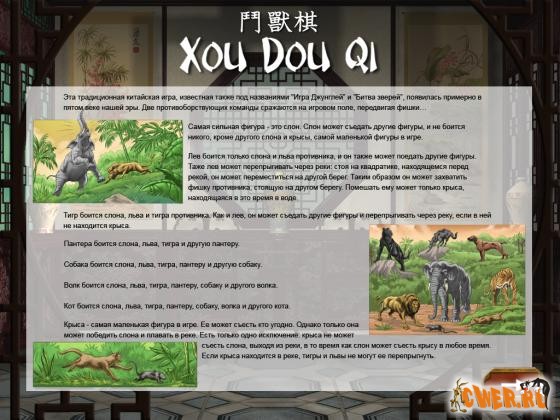 Технический прогресс лишь недавно подарил человеку компьютер. Но люди играли со времён глубокой древности. История великих народов помнит игры, которые были не только развлечением, но и служили пищей для ума. За шахматной доской оттачивали свое стратегическое мышление полководцы Запада и ближнего Востока. А их китайские коллеги придумали собственный вариант настольных сражений. В игре на клеточном поле сходятся две армии, солдаты в которых не люди, а животные. Конечная цель - захватить логово противника!
