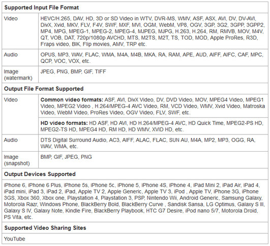 Также программа имеет встроенный мощный алгоритм преобразования медиафайлов благодаря которому можно конвертировать их с очень высокой скоростью. Это также и мощный аудиоконвертер, способный конвертировать между MP3, AAC, AC3, WAV, WMA, FLAC, OGG, AIFF и т. д. Кроме того, он может извлекать аудио из видео. Поддерживает конвертирование видео для большинства цифровых устройств, включая iPad, iPad mini, iPod, iPhone (including iPhone 6 and iPhone 6 Plus), Android, Samsung Galaxy, Google Nexus, Microsoft Surface, BlackBerry, Apple TV, Zune, PSP, PS3, Pocket PC, Creative Zen, Xbox, Archos и других.