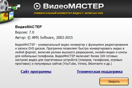 ВидеоМАСТЕР — универсальный видео конвертер с возможностью записи DVD дисков. Программа позволяет быстро конвертировать видео в любой формат, включая ролики высокого разрешения и онлайн-видео. Конвертер включает более 320 готовых настроек видео для мобильных устройств (плееров, телефонов, игровых приставок) и популярных сайтов, таких как YouTube, Vimeo, ВКонтакте и др.