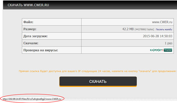 которая будет вести на вирусный *.exe файл. Теперь, чтобы вручную выпрямить ссылку, необходимо из предоставленной ссылки скопировать часть, начинающеюся с "http://192.99..." и заканчивающеюся на *название_файла.формат* (4to_to_tam.rar)