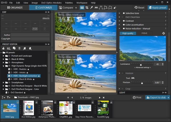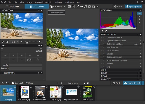 DxO Optics Pro - профессиональное приложение, способное улучшить и скорректировать вашу коллекцию цифровых фотографий. DxO Optics Pro содержит множество прогрессивных технологий, с помощью которых можно настроить яркость, контрастность, цветовой баланс, избавиться от искажений и повысить четкость изображений, исправить цвета и экспозицию по краям и в углах фотографии, отрегулировать баланс белого цвета с учётом цветовой температуры и многое другое.