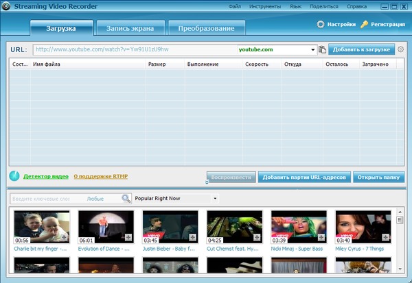Streaming Video Recorder является единой программой для записи видео потоков, сериалов и фильмов от тысяч видео-сайтов, таких как YouTube, Google Video, Blip TV, Justin TV, CBS, и т.д. Запись никогда не была легче и быстрее. Пока видео проигрывается, встроенный детектор автоматически обнаружит и добавит их в очередь для загрузки.