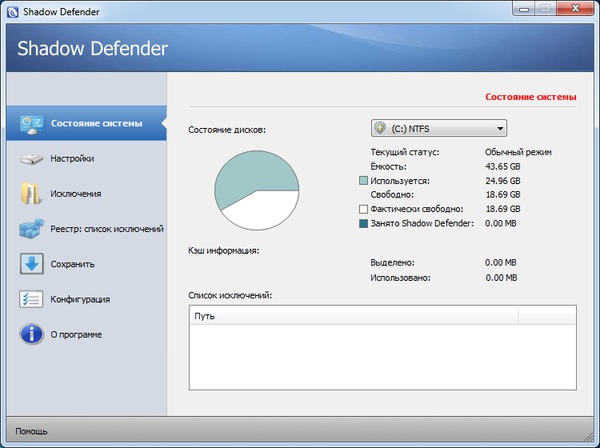 Shadow Defender – программа, аналогичная программе ShadowUser, позволяющей поставить систему в режим тени - Shadow mode, при котором невозможны ни удаление важной информации, ни атака вирусов. Данная утилита также обеспечивает защиту компьютера и конфиденциальности информации, предотвращает нежелательные и злонамеренные изменения в вашем компьютере, позволяет загружаться в виртуальном теневом режиме с выборочным сохранением данных. Имеет интуитивно понятный интерфейс.