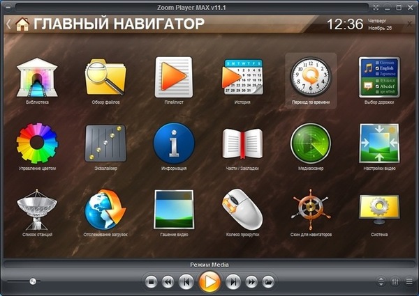 Zoom Player 11 — наиболее мощный, гибкий и настраиваемый DVD/Blu-ray и медиа плеер для операционных систем Windows. Проигрывает DIVX, MP3, MPA, WAV, WMA, ASF, ASX, AVI, DAT, MPG, MPEG, VOB, WM, WMV. Поддерживает плейлисты, управление горячими клавишами и из командной строки, полноэкранный режим работы, маcштабирование широкоэкранного фильма для удаления полос снизу и сверху экрана, несколько видов представления интерфейса и его изменение с помощью скинов.