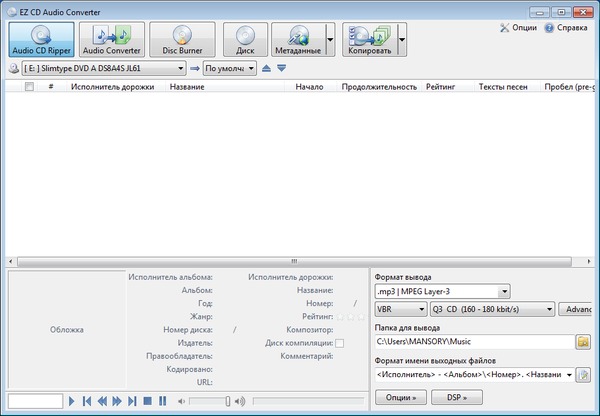 EZ CD Audio Converter - утилита для преобразования аудио-CD в качественные цифровые аудиофайлы, а также для записи MP3, WAV MP4, Windows Media Audio, FLAC, Ogg Vorbis, AAC и Monkey-s файлов на аудио-CD. Умеет преобразовывать аудиотреки непосредственно в MP3, WMA, VQF, OGG или WAV и конвертировать из одного аудиоформата в другой.