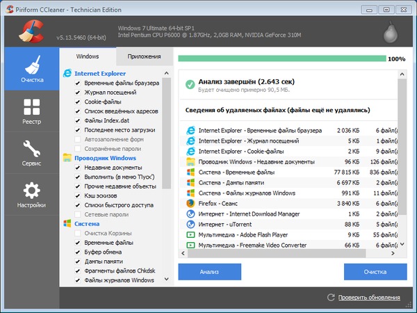 - Чистка данных других программ. CCleaner также очищает временные файлы и списки недавно открытых файлов других программ, например: Media Player, Safari, eMule, Kazaa, Google Toolbar, Netscape, MS Office, Nero, Adobe Acrobat, WinRAR, WinAce, WinZip и другие...