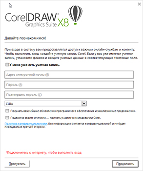 После того как установите данную программу (CorelDraw X8), открываете папку с установленной программой (в зависимости от разрядности) *:\Program Files (x86)\Corel\CorelDRAW Graphics Suite X8 и удалите все (какие найдете) файлы: RMPCUNLR.DLL и HMPCUNLR1.DLL - после этой процедуры проблема с учетной записью отпадет... всем удачи!!!