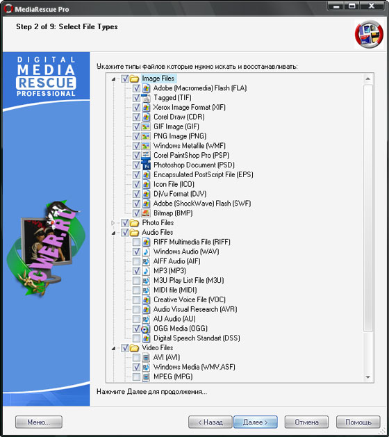 - Поддерживает восстановление всех типов графических и видео изображений, а также все аудио файлы