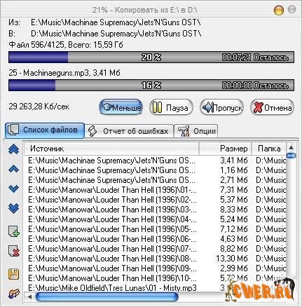 Несколько разнообразит монотонный процесс копирования файлов, особенно если предстоит скопировать большой обьем данных: вместо стандартного малоинформативного окна во время копирования (перемещения) выводит свое собственное, в котором показывает всевозможную информацию о проходящем процессе - скорость, обьем данных, полный путь к копируемым файлам, оставшееся время и многое другое.