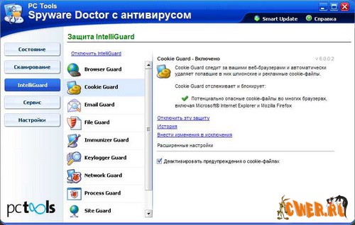 Некоторые программы, равно как и веб-страницы, содержат шпионские модули, которые переселяются на ваш компьютер, собирают конфиденциальную информацию и отправляют ее по заданному адресу. Чтобы перекрыть им путь на ваш компьютер, используйте Spyware Doctor. Он распознает все известные шпионские модули и не дает им загрузиться и запуститься на вашем компьютере. Программа имеет мультиязычный интерфейс включая Русский.