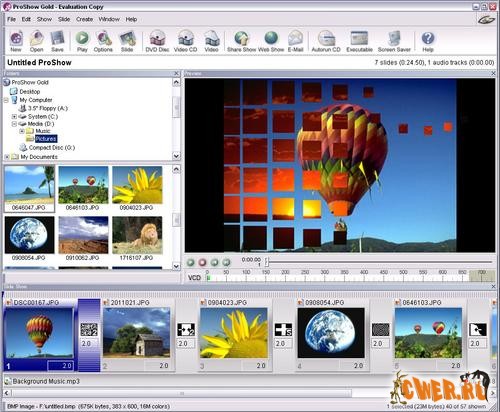 Photodex ProShow Gold имеет в арсенале 170 эффектов перехода между слайдами плюс возможность загрузить звуковое сопровождение, многочисленые новороты и прочие очень полезные вещи, которые в обязательном порядке пригодятся вам для создания проффесионального слайд-шоу.