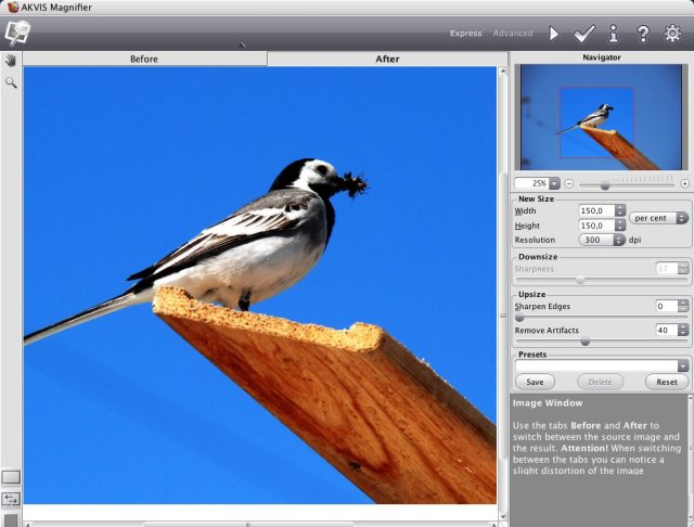 - AKVIS Magnifier расширяет допустимый лимит пикселей и включает дополнительные значения разрешения. Модернизированный пользовательский интерфейс теперь поддерживает Ultra HD разрешение, что делает программу гораздо более удобной в использовании. Почувствуйте преимущества передовых технологий визуализации!