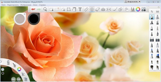Интерфейс программы прост в изучении, а те, кто уже освоил его, могут работать с высокой скоростью и максимальной эффективностью. Полотно, на котором ведется рисование, можно масштабировать, перемещать и поворачивать. Инструменты для задания размера кисти всегда под рукой; открывать Редактор кистей при этом не нужно. - Взаимодействие с другими программами