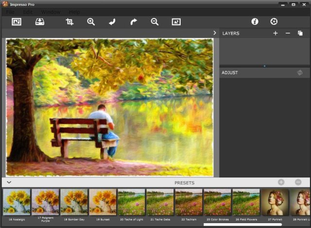 Artista Impresso - редактор для создания рисунков в стиле импрессионизма. Используйте слои, чтобы объединять различные стили рисования и глубину мазков импрессионистов. Также может работать как плагин для Adobe Photoshop, Lightroom и Elements. Поддерживает прозрачность, смешивание, команду 'Последний фильтр', пакетную обработку, 16-битные режимы RGB и градации серого.