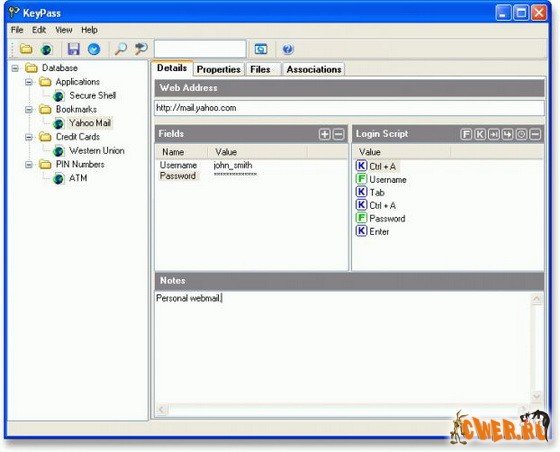 KeyPass stores all your sensitive information in an encrypted database. The information is encrypted using 448-bit blowfish algorithm and a master password is required to unlock the information in the database. You can be sure that only you have access to secret information such as passwords, credit card numbers, PIN numbers and sensitive documents.