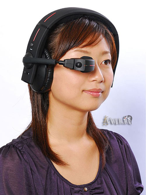 Новинка представляет собой наушники, на которых установлен подвижный окуляр, глядя в который, можно увидеть находящийся на трёхметровом удалении виртуальный экран с диагональю 50 дюймов. На этом экране есть возможность просмотра видеофайлов в форматах MPEG-1, MPEG-2 и WMV, причём поддерживается разрешение 640 x 480 пикселей. Кроме того, благодаря реализованной поддержке Wi-Fi 802.11g обладатель устройства может посещать веб-сайты и даже покупать музыку или видео в онлайн-магазинах. Кроме того, если переместить окуляр вверх к оголовью, то изделие трансформируется в аудиопроигрыватель, легко оперирующий AAC-, MP3- и WMA-файлами. Примечательно и то, что решение снабжено датчиком движения, что позволяет вращением головы менять уровень громкости или осуществлять навигацию по контенту. В качестве же источников питания у этого чуда инженерной мысли выступают всего две батарейки типа АА, заряда которых вполне хватает на два часа непрерывного воспроизведения видео либо на четыре с половиной часа безостановочного прослушивания музыки.