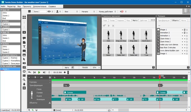 Demo Builder - программа для создания профессиональных презентаций, интерактивных обучающих роликов и прочих руководств. Имеет необходимые инструменты редактирования, добавления эффектов, работы с объектами и так далее. Автоматически захватывает все действия, производимые в запущенном приложении, позволяя затем редактировать ролики, добавлять аннотации, создавая при этом презентацию.