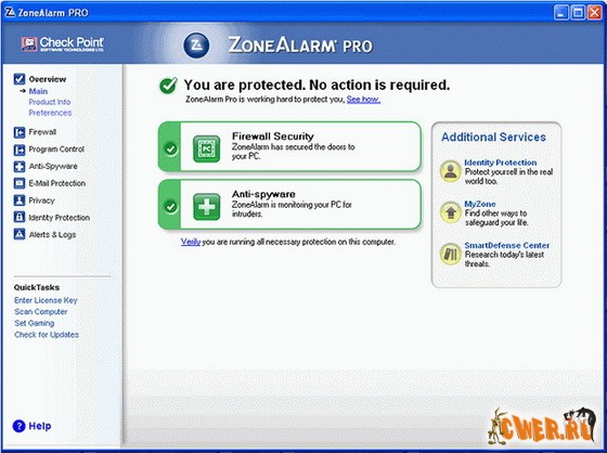 ZoneAlarm Pro - хорошо известный файерволл, один из лучших в мире на сегодняшний день. Защищает компьютер от внешних угроз при работе в интернете и локальной сети. Блокирует атаку, не давая возможность получить доступ к компьютеру пользователя, имеет режим "стелс" невидимки в сети. Перекрывает выход в Интернет шпионским программам для пересылки личной информации. Защищает программы и операционную систему от вредоносного программного обеспечения и пр. Как необязательное дополнение в ZoneAlarm Pro встроена антивирусная Anti-Spyware программы. Интерфейс хоть и на английском языке, но интуитивно понятен и позволяет даже новичку легко освоить основные возможности файерволла, а для специальных настроек и требований имеется апплет "эксперт".