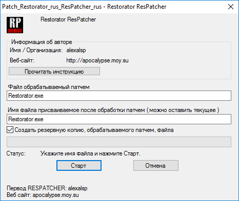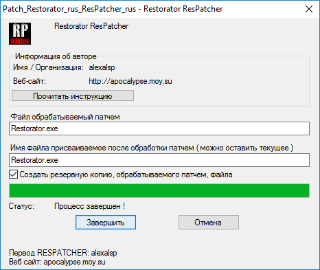 - Создание программы автоматизированной модификации - ResPatcher. Используя Restorator Вы можете создать маленькую исполняемую программу - ResPatcher, которая содержит все, сделанные Вами изменения. Это дает Вам возможность перевести любое приложение и распространять перевод другим лицам.