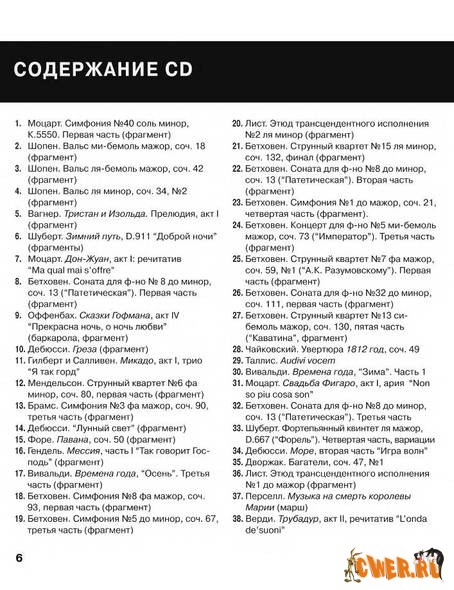 Книга включает бесплатный CD объемом звучания более 70 минут с первоклассными записями классической музыки, осуществленными в сотрудничестве с компанией EMI Classics. Книга поможет каждому получать удовольствие, слушая классическую музыку легко и непринужденно. Не предполагает никакого специального образования, знания музыкальной терминологии. Сопровождается набором рекомендаций для более широкого знакомства с классическими произведениями. Содержит превосходные цветные иллюстрации.