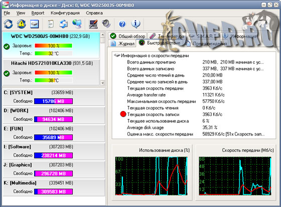 Отслеживает температуры, скорость работы и значения S.M.A.R.T. для каждого из дисков в системе. Обо всех приближающихся критических параметрах программа извещает пользователя, и весь ход событий записывает в журнал, чтобы снять волнения о возможных пропущенных сообщениях программы.