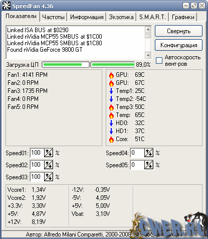 SpeedFan - бесплатная системная утилита для контроля за параметрами материнской платы. Программа отслеживает скорости вращения вентиляторов и температуру в системном блоке (кулеры процессора, блока питания, системного блока, жесткого диска и т.д.). Основная функция программы заключается в регулировании скорости вращения кулеров в зависимости от соответствующих температур. Это позволяет снизить энергопотребление во время незначительного использования ресурсов компьютера. Вращение можно регулировать вручную и автоматически. Обратите внимание, что регулировка скорости вращения вентиляторов возможна только при условии, что на материнской плате установлен соответствующий датчик. Еще одной функцией этой утилиты является возможность автоматической регуляции частот внутренней шины процессора и шины PCI.
