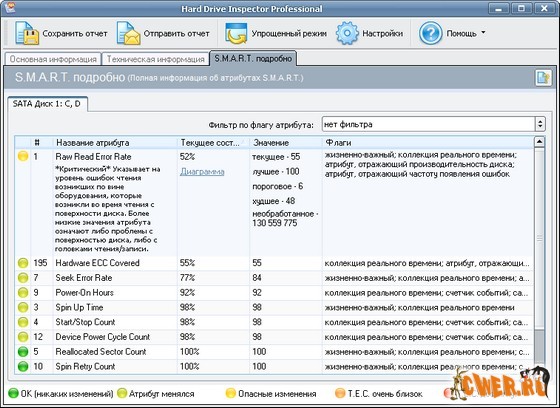 Современные жесткие диски поддерживают технологию S.M.A.R.T. (Self-Monitoring, Analysis, and Reporting Technology), которая была специально разработана для обнаружения грядущих выходов дисков из строя. Используя эту технологию, Hard Drive Inspector может осуществлять наблюдение за текущим состоянием различных жизненно-важных параметров, описывающих надежность и производительность диска. Hard Drive Inspector анализирует эти данные и предупреждает пользователя в том случае, когда параметры указывают на критическое падение надежности винчестера. Это во многих случаях позволяет предотвратить потерю информации.