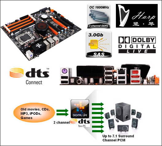Примечательно и то, что за вывод 7.1-канального звука HD Audio отвечает поставляемая в комплекте аудиокарта HARP, которая характеризуется соотношением сигнал/шум 110 дБ и поддерживает такие технологии, как Dolby Digital Live и DTS Connect (DTS Interactive и DTS Neo:PC).