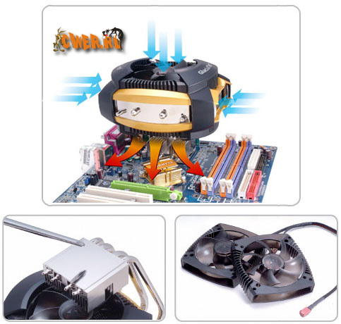 Данное изделие весом 780 г имеет габариты 130 х 157 х 138 мм и внешне действительно выглядит как космический корабль пришельцев из других миров. Конструктивно новинка состоит из медного основания с никелированным покрытием, от которого отходят две тепловые трубки толщиной 8 мм и пара тепловых трубок диаметром 6 мм. Они пронизывают многочисленные тонкие пластины массивного алюминиевого радиатора, с обеих сторон которого разработчики установили по одному вентилятору типоразмера 92 х 92 х 25 мм.