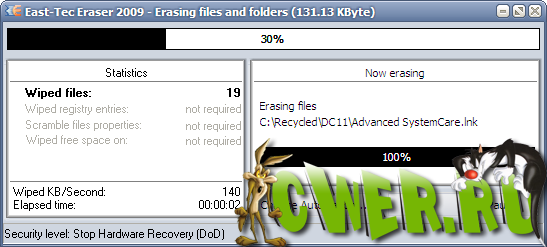 East-Tec Eraser 2009 - мощная программа для очистки Вашей системы от мусора и следов пребывания в интернете без возможности восстановления! Комплексное уничтожение таких данных как: история IE, история открываемых документов, cookies, переговоров в чатах, темп файлов IE и системы, свопа, кусков от Офиса, личные файлы, файлы по маске и т.д.