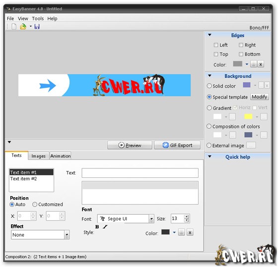 Позволяет вам быстро и просто создать анимированные баннеры для вашего веб сайта. Данная программа позволяет создавать баннеры самым простым способом. Вы выбираете первую композицию текста и элементы изображений, потом вы настраиваете данный текст и изображения, выбираете фон и границы баннера и потом настраиваете анимацию. Более того, EasyBanner имеет примеры баннеров, фоновых шаблонов, маленькую библиотеку изображений и специальных эффектов. Для того чтобы установить баннер на ваш сайт, программа использует функцию экспорта GIF.