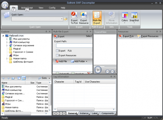 Программа для конвертирования SWF в FLA и извлечения из них различных ресурсов. С помощью утилиты можно извлекать звуки, изображения, сценарии, шрифты и т.п. из готовых Flash-роликов.