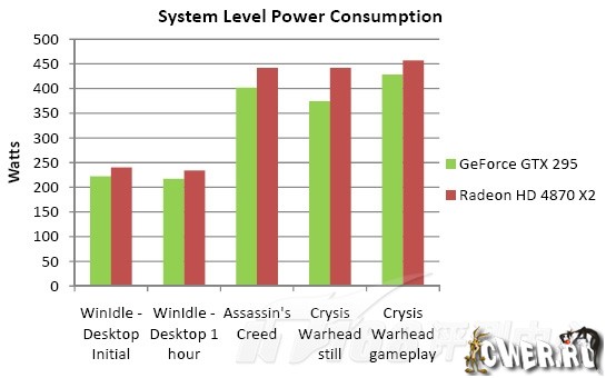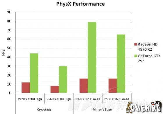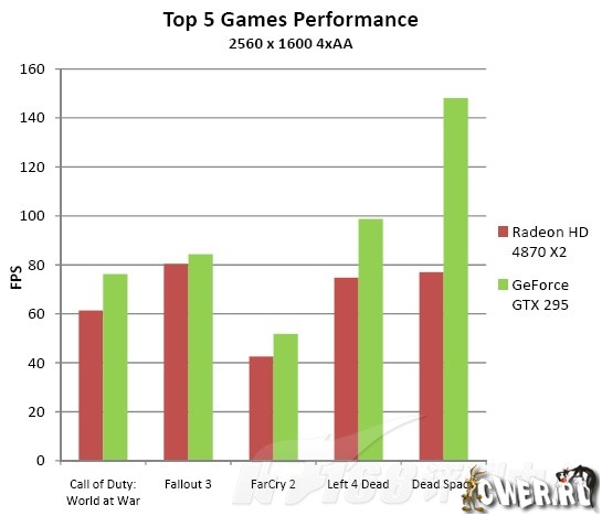 Что же касается результатов первых тестов, то они приведены ниже. Однако стоит отметить, что увы, ничего не сообщили о том, на каком именно оборудовании проводились испытания и какие при этом использовались драйверы. Так что пока придётся принять на веру тот факт, что NVIDIA GeForce GTX 295 практически во всём превосходит ATI Radeon HD 4870 X2, причём кое-где даже с огромным отрывом.
