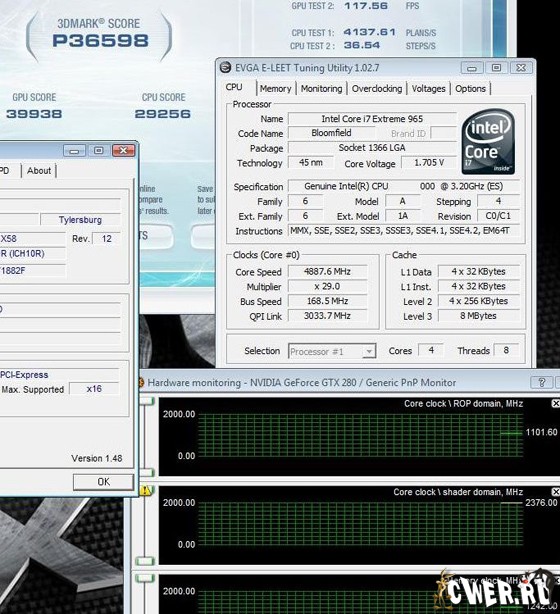 Материнская плата EVGA X58 SLI приютила три видеокарты GeForce GTX 280 производства EVGA, которые в связке 3-Way SLI были разогнаны под жидким азотом до частот 1102/2376/2484 МГц. Центральный процессор Core i7-965 Extreme Edition был разогнан до 4888 МГц под неизменным жидким азотом, что тоже неплохо для такой нагрузки.