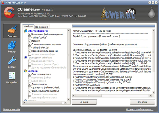 CCleaner, в зависимости от настроек, чистит следующие компоненты Windows: