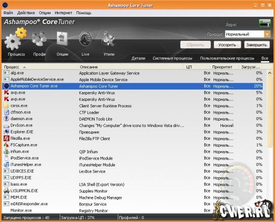 Ashampoo Core Tuner - новая программа от немецкого разработчика, которая позволяет оптимизировать производительность вашего многоядерного процессора. Многие современные компьютеры работают на двухядерных процессорах, некоторые даже на четырехядерных. К сожалению, Windows не всегда хорошо управляет несколькими ядрами, из-за чего вы не получаете реальную мощность и производительность от купленного процессора. Данная программа позволяет исправить ситуацию, оптимизировав производительность вашего ЦПУ. Для мгновенного результата вы можете нажать на кнопку авто-оптимизации, после чего для всех ваших запущенных программ будет сделана оптимизация, по использованию центрального процессора. Однако, вы также сможете самостоятельно настроить использование процессора для каждой программы по-отдельности. Кроме этого, вы сможете отладить отдельные процессы, просматривать в реальном времени производительность каждого из ядер вашего процессора или повысить общую производительность системы, с помощью дополнительных инструментов, встроенных в программу.