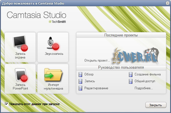 Camtasia Studio включает в себя четыре утилиты: Camtasia MenuMaker, Camtasia Player, Camtasia Theater и Camtasia Recorder. Для работы со всеми этими утилитами служит главный интерфейс программы.