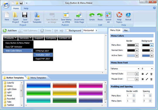 Blumentals Easy Button and Menu Maker Pro - поможет вам легко создавать сложные кнопки и профессиональные динамические меню для веб-сайта за считанные минуты. В программу включено более 100 элегантных готовых шаблонов включая самые популярные - Cтекло и Виста. В отличие от большинства других программ Easy Button & Menu Maker Pro имеет WYSIWYG редактор который значительно убыстрит создание кнопок или меню сайта.