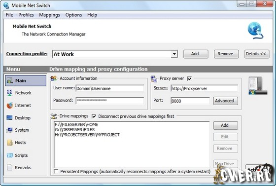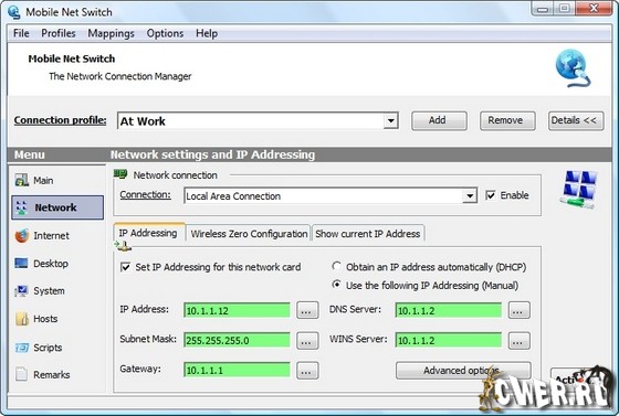 Windows слабо приспособлена для работы с несколькими сетевыми подключениями одновременно, и необходимость менять опции интернет-соединения вручную каждый раз, когда вы хотите перейти с локальной сети на ADSL-модем, мягко говоря, неудобно. Еще хуже обстоят дела у мобильных пользователей, которые постоянно в движении и вынуждены заново настраивать параметры подключения к интернету, sharing и т.д. на каждом новом месте. Mobile Net Switch позволит с легкостью избавиться от всех этих неудобств. Программа умеет работать с неограниченным числом интернет-профилей и мгновенно переключаться между ними без перезагрузки ПК. Остается только внести необходимые данные (IP-адрес вашего ПК, интернет-шлюз, координаты DNS-серверов и т. д.) для каждого из профилей и навсегда забыть о подобных проблемах.
