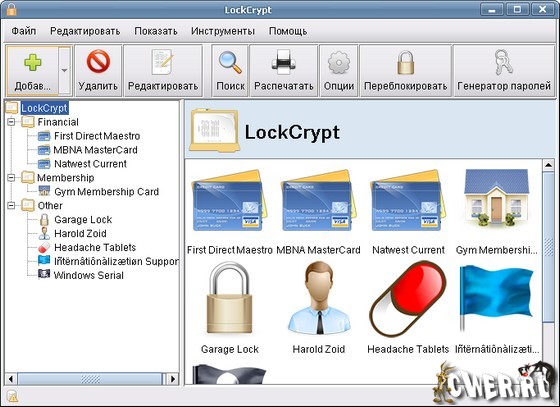 Программа для ведения базы учетных записей, паролей и прочей конфиденциальной информации. LockCrypt предоставляет безопасную, центральную базу данных для того, чтобы хранить трудно запоминаемые пароли и другую личную информацию.