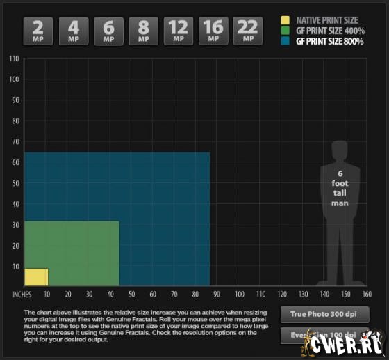 В Genuine Fractals используется фрактальный способ увеличения. Каждый участок картинки растягивается с учетом ее локальных геометрических характеристик. Это позволяет избегать обычных артефактов интерполяции: вертикальные и горизонтальные линии между контрастными областями не размываются; вдоль наклонных не образуются зубцы, а вокруг острых углов - ореолы; контрастные фактуры не теряют четкости, но и не превращаются в решетки из укрупненных пикселей.