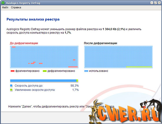 Auslogics Registry Defrag - отличная бесплатная программа для дефрагментации реестра операционной системы. Auslogics Registry Defrag позволяет ускорить работу Windows за счет дефрагментации реестра, оптимизации размещения информации в нем, а также благодаря исправлению ошибок, накапливающихся в реестре в процессе его долгой эксплуатации. ОС Windows осуществляет сотни обращений в секунду для чтения и записи данных в реестре и его медленная работа - одна из важнейших причин медленной работы всей системы в целом. Auslogics Registry Defrag проведет анализ реестра, чтобы выяснить, следует ли делать дефрагментацию и какие результаты получатся. После завершения анализа и работы, Auslogics Registry Defrag подготавливает подробный и понятный отчет с результатами своей работы.