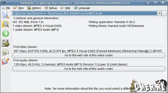 Вышла новая версия бесплатной программы, которая предоставляет подробную информацию об аудио и видео файлах. Программа показывает, каким кодеком сжато видео, с каким битрейтом, какое в нем соотношение сторон и количество кадров в секунду. Для аудиофайла MediaInfo показывает используемый кодек, битрейт, язык, количество каналов, частоту выборки и т.д. Показав сведения о файле, программа тут же посоветует, где можно скачать недостающий кодек или проигрыватель.